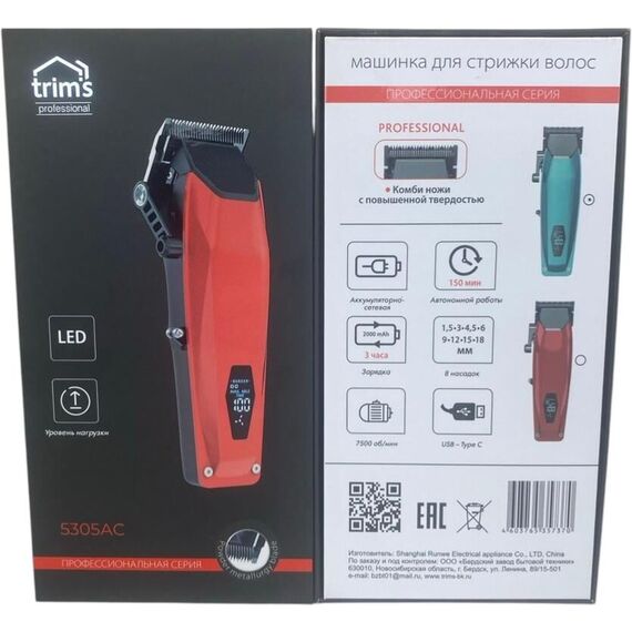 Профессиональная машинка для стрижки волос. Мотор постоянного тока ДС - 5600 оборотов в минуту. LCD дисплей, показывает уровень зарядки и разрядки, если уровень зарядки ниже 20 единиц, необходимо зарядить аккумулятор. Работает от аккумулятора и от сети. Конструкцией машинки предусмотрены 4 насадки, позволяющие выдерживать одинаковую длину стриженных волос (3, 6, 9 и 13мм). Используя прибор без насадки длина стриженных волос будет от 0,8-2,4мм, в зависимости от положения рычага регулировки длины стриженных волос. Номинальная потребляемая мощность в режиме зарядки аккумуляторов 7Вт. Время до полной зарядки - 2,5часа, время автономной работы - 2,5часа. Литивый аккумулятор 3,7В, 2000 мА/ч. Стальные ножи - повышенной твердости. Длина шнура 1,8м.