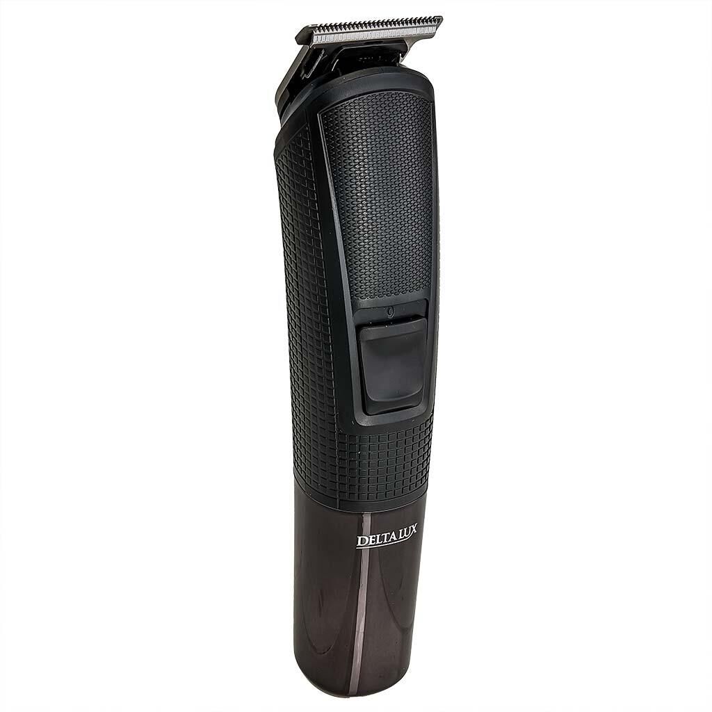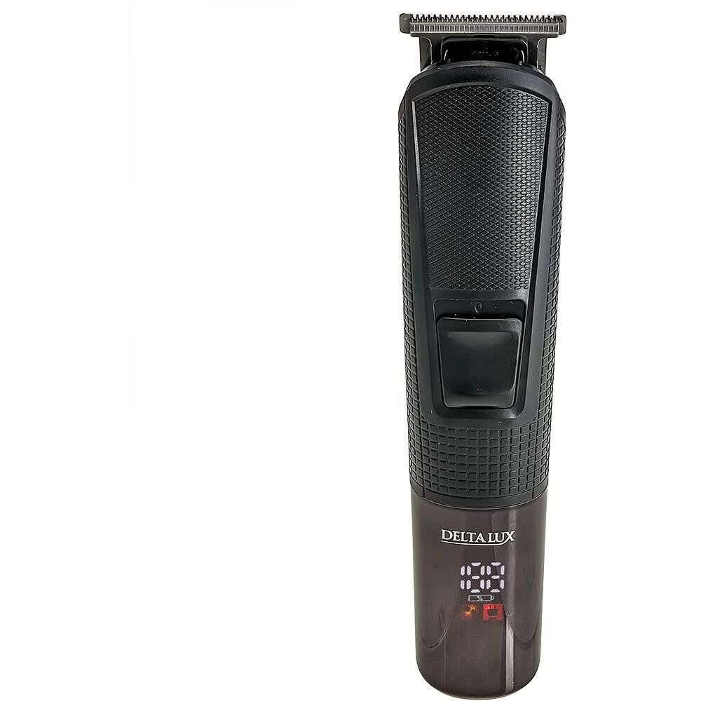 Набор для стрижки и бритья 5 в 1. Потребляемая мощность 5 Вт, Время непрерывной работы до 90 минут, Время заряда аккумуляторной батареи 90 минут, Температура эксплуатации от +5°С до +35°С, Лезвия из нержавеющей стали, LED-дисплей, 2 режима работы: от сети питания и от аккумулятора, Тип аккумуляторной батареи: 14500 Li-ion 3,7 В 600 мА-ч, 5 съемных насадок:насадка-бритва, насадка для коррекции и дизайнерской стрижки, насадка для носа и ушей, насадка стандартный триммер, насадка узкий триммер для подравнивания. Щеточка для чистки лезвий, Подставка для хранения набора.