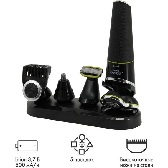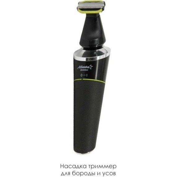 ATLANTA ATH-6926 (BLACK) Набор для стрижки и ухода Li-ion аккумулятор 3,7 В 500 мА/ч Насадка бритва с тремя двойными плавающими головками Насадка триммер для бороды и усов Насадка триммер для ухода за телом Насадка триммер для стрижки в носу и ушах Питание от аккумулятора и от кабеля USB Все насадки можно промывать в воде, степень защиты IPX5 Время зарядки 2 часа Время работы 1 час Подставка для всего набора