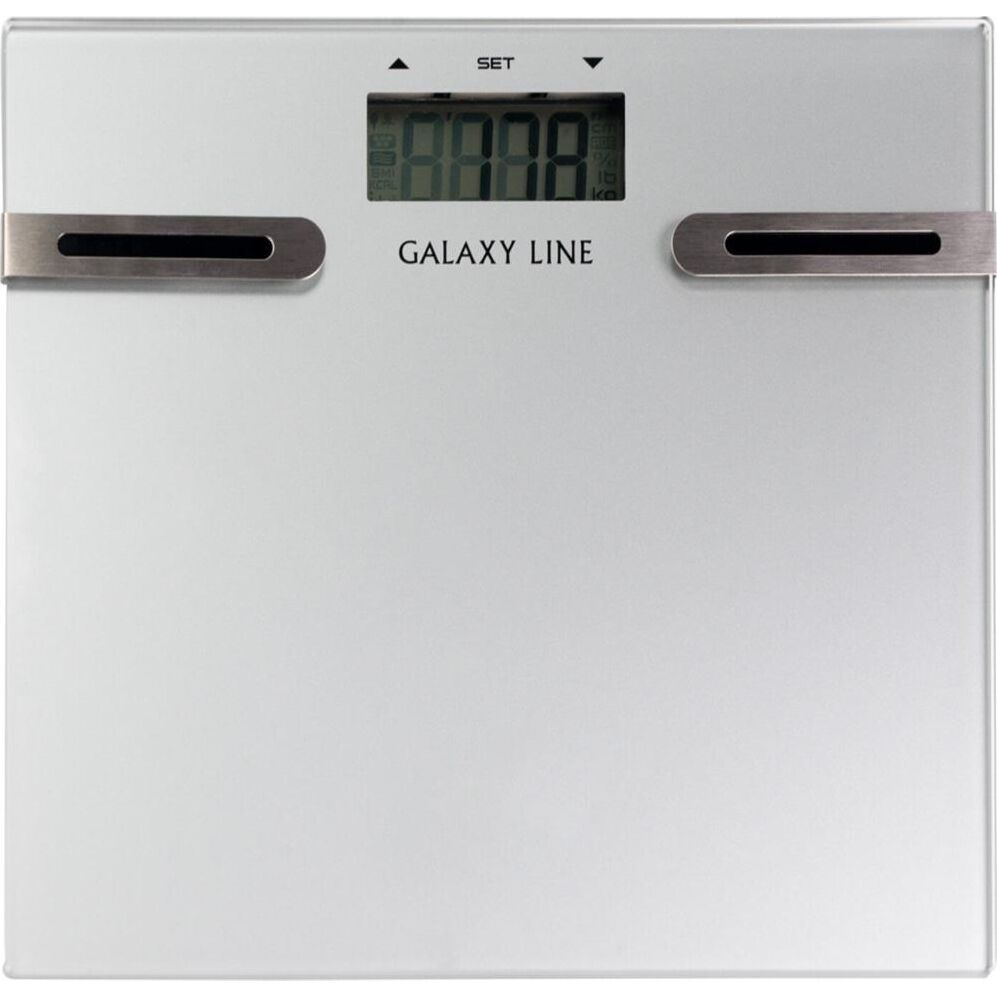 GALAXY LINE GL 4855 Элемент питания «ААА», 2 шт. (в комплекте) Сверхточная сенсорная электронная система Платформа из высокопрочного стекла Жидкокристаллический дисплей Максимально допустимый вес 150 кг Цена деления 100 г Определение веса, жировой, мышечной, костной масс, уровня жидкости, индекса массы тела Определение суточной нормы калорий Память на 12 человек Автоматическое отключение Индикатор перегрузки Индикация низкого заряда элемента питания Единицы измерения: килограмм, фунт Прорезиненные ножки для устойчивости и предотвращения скольжения