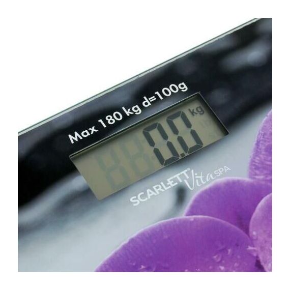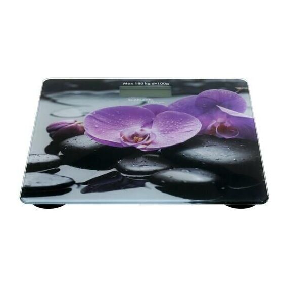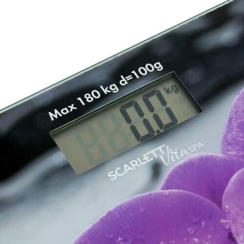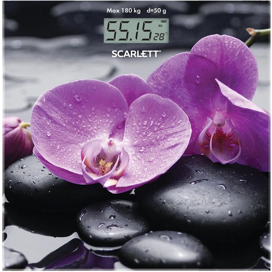 Тип: Электронные. Материал корпуса: Стекло. Максимальный вес, кг: 180. Цена деления, г: 100. Индикатор заряда батарейки: Да. Индикатор перезагрузки: Да. Автоматическое включение/выключение: Да. Тип батарейки/B/шт.: 1 х ЗV типа CR2032 (в комплекте). Рисунок: Орхидеи. Прорезиненные ножки для устойчивости: Да.