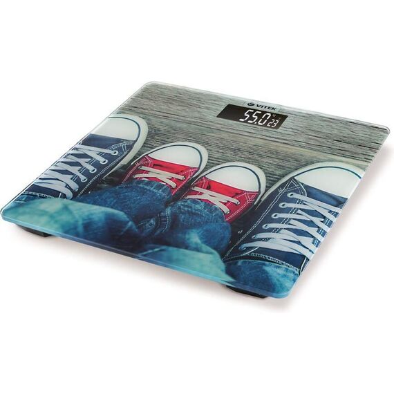 Весы напольные, электронные. Точность измерения 50г гр., Максимальная нагрузка до 180 кг., Материал платформы: закаленное стекло, Белая подсветка дисплея, Подсветка дисплея, Размер дисплея: 75х35 мм., Авто обнуление и авто отключение, Автоматическое включение/ выключение, Единицы измерения: кг/фт., Отображение комнатное температуры, Тип элементов питания: 2хAAA, Габариты:30х30 см. Цвет: Принт ( Кеды)