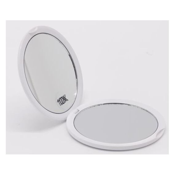 Зеркало косметическое двойное (1х / 10х) складное ( без подсветки) Camelion M148-DL . Может использоваться в качестве карманного зеркала и как компактный вариант дорожного зеркала. Корпус из пластика белого цвета. В комплекте два высококачественных зеркала диаметром ~ 9 см – обычное и с увеличением 10Х, что позволяет делать сложный макияж, косметологические процедуры и существенно облегчает нанесение макияжа для людей с ослабленным зрением. Зеркало в пакете из воздушно-пузырчатой плёнки упаковано в красочную индивидуальную коробку. Гарантийный срок – 12 месяцев.