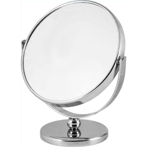 Зеркало косметическое двустороннее на ножке (1Х5) Диаметр: 12,5см Размер: 13,5*8*15 см Материал: хромированный металл, стекло С одной стороны - обычное зеркало, с другой - с 5-кратным увеличением Упаковка: картонная коробка Двустороннее настольное зеркало отлично подойдет для нанесения макияжа и проведения процедур по уходу за кожей лица. У зеркала две поверхности, одна из которых дает обычное отражение, другая - с 5 кратным увеличением.