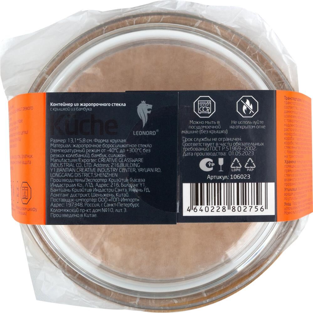 Контейнер для продуктов LEONORD Контейнер BAMBU, объем: 400 мл, из жаропрочного стекла с крышкой из бамбука, круглый (106023)