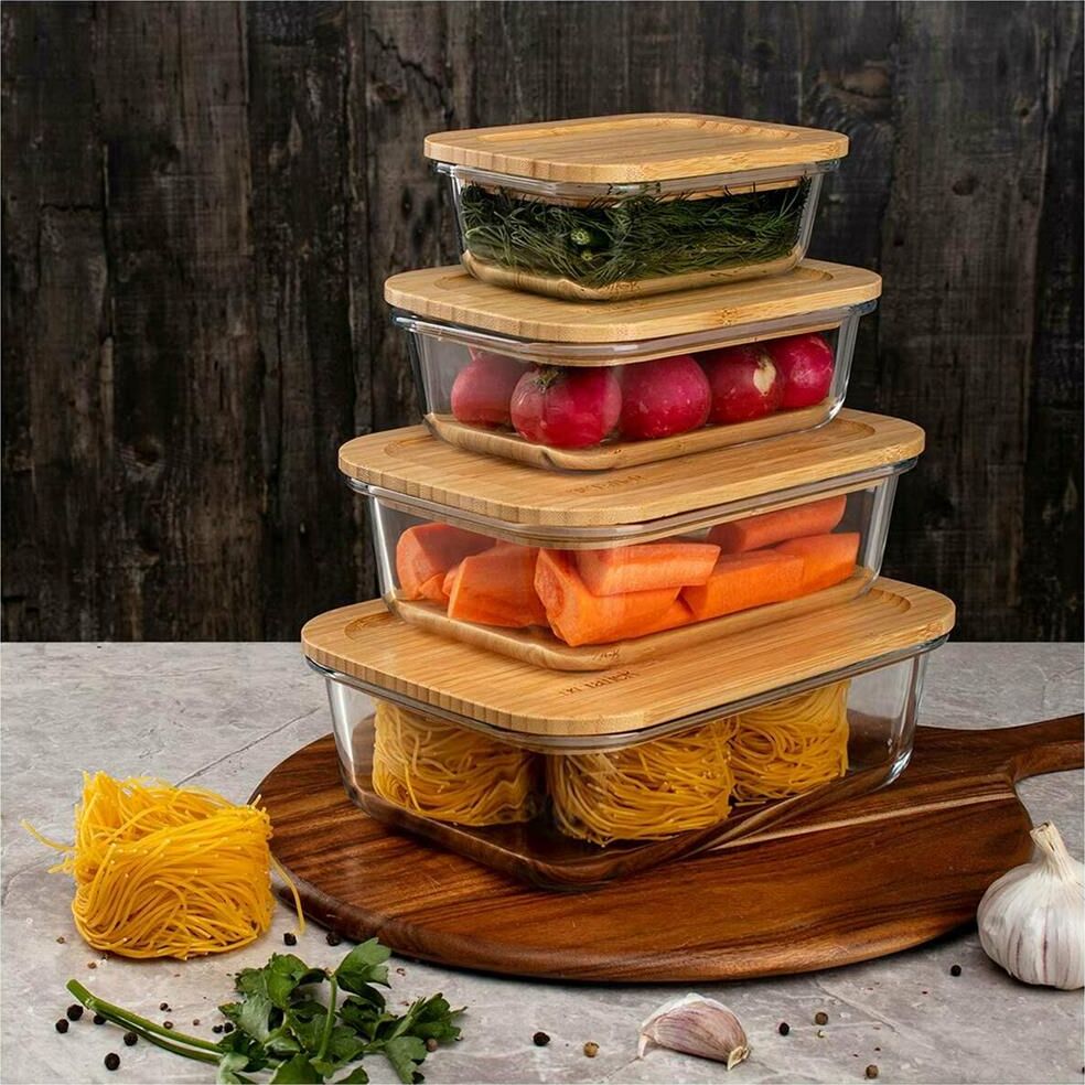 Контейнер жаропрочный, 970 мл, 19,8*14,8*6,7 см Материал: боросиликатное стекло, бамбук Температурный режим для контейнера: до 400 °C Температурный режим для крышки 0°C ~ +30°C. Контейнер без крышки можно мыть в посудомоечной машине.