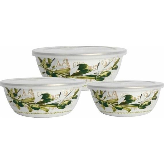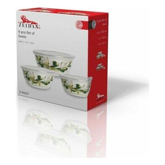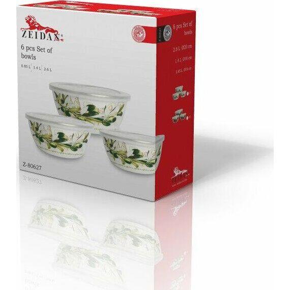 Набор мисок ZEIDAN Z-80627-01, 6 предметов, Набор мисок, 6 предм. (3 МИСКИ С КРЫШКАМИ: 0,85 Л (d16 см), 1,4Л (d18 см), 2,6 Л (d20 см) с внутренним эмалированным покрытием), эмалированная сталь, внешнее покрытие - эмаль с рисунком. Подарочная упаковка.