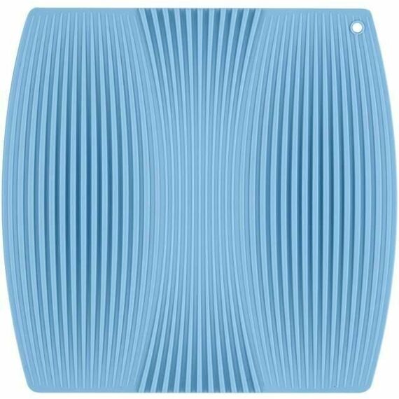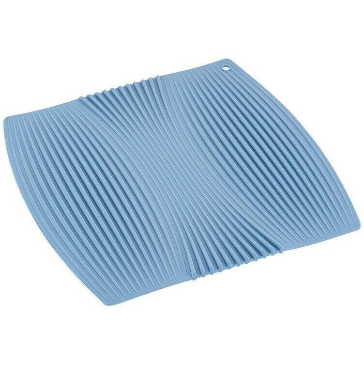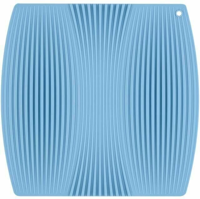 Материал: высококачественный силикон. Цвет: голубой. Используется как подставка для сушки посуды, ребристая поверхность помогает ей быстро сохнуть, может использоваться как прихватка. Не содержит бисфенол А и фталаты. Вес: 300 г. Размеры: 22х23х0,5 см