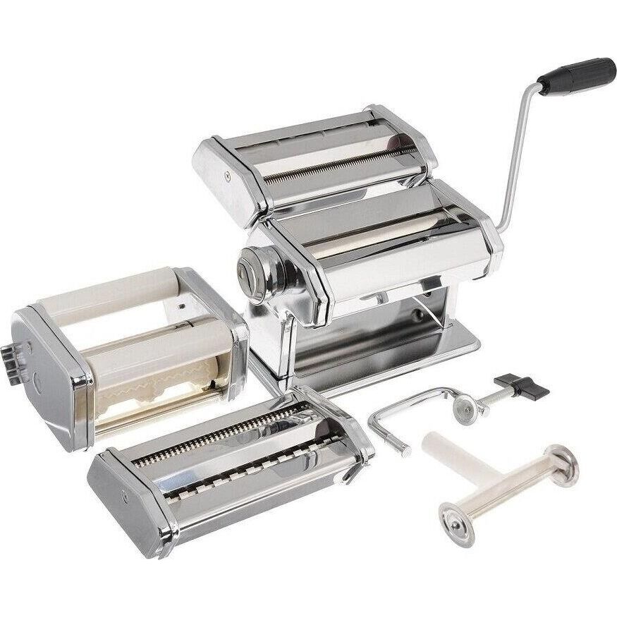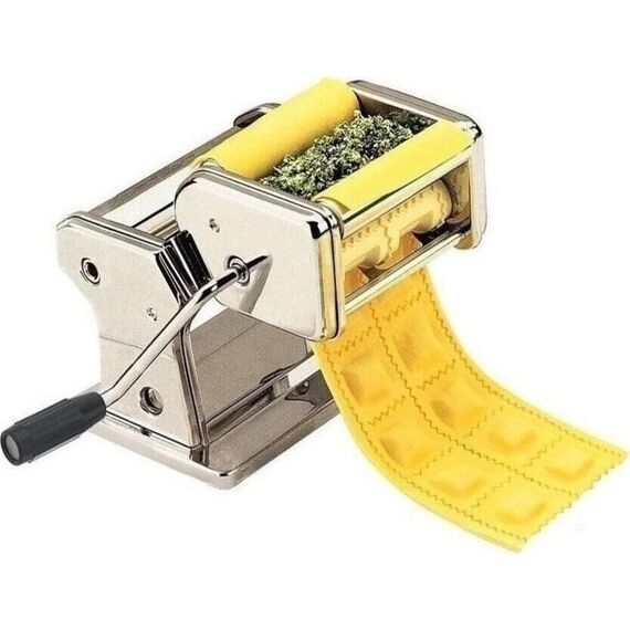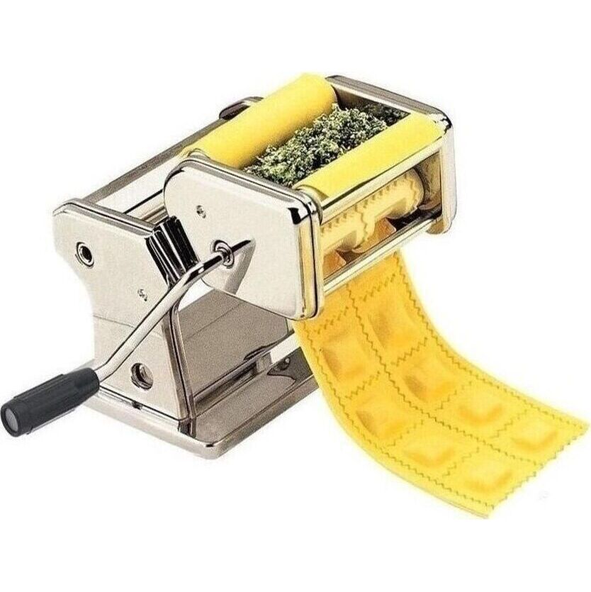 Насадка д/пельменей (равиолли). 9 режимов толщины раскатки теста. Нож д/резки теста. Нарезной блок для 2-х видов лапши. Нарезка лапши 2мм и 6.6мм. Валик д/раскатки теста. Регулятор толщины теста. Механический привод. Инструкция + рецепты.