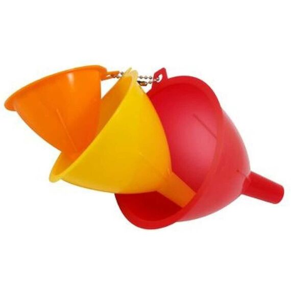 Набор воронок 3 штуки в наборе, диаметры 10, 8 и 7 см размер: 11*10,5*10см Материал: полипропилен Упаковка: хэнгтаг Набор воронок используется для переливания различных жидкостей в емкости с узким горлышком.