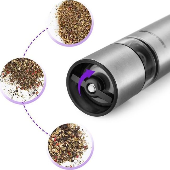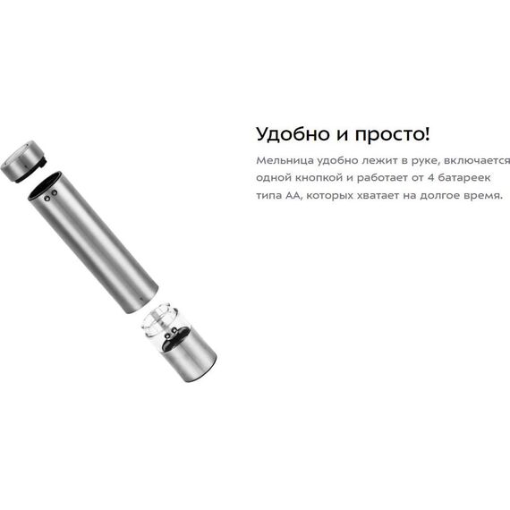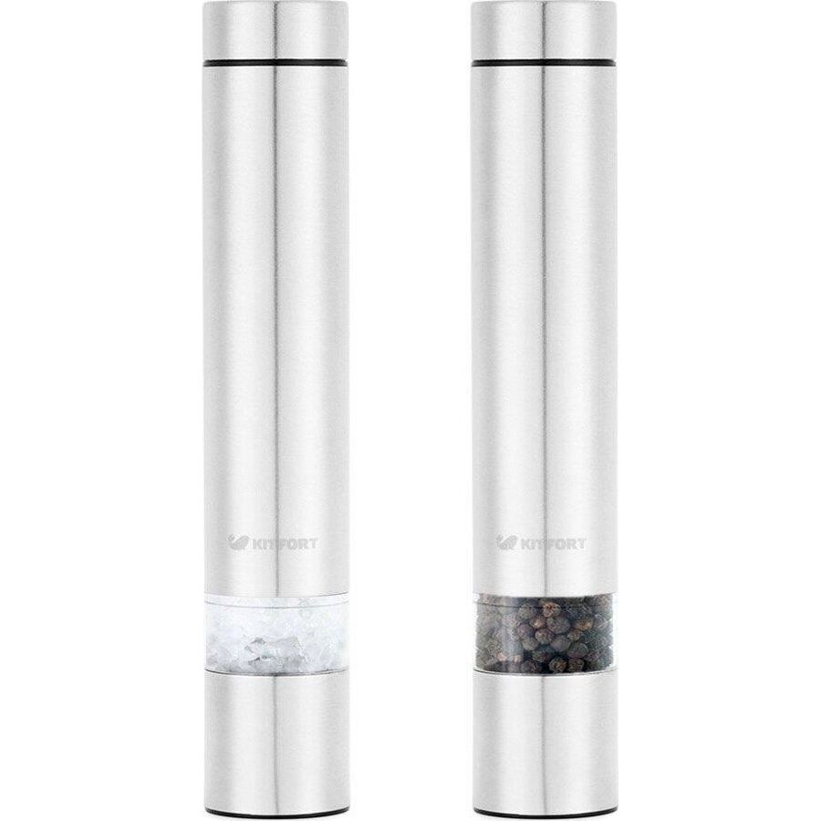 Набор мельниц Kitfort KT-2028 измельчает перец-горошек, соль и другие специи. Нет нужды молоть специи впрок. Мельница одновременно мелет и дозирует. Поместите её над блюдом и просто нажмите кнопку. Электропитание от батарей AAA. Количество элементов питания 4. Материал корпуса металл.