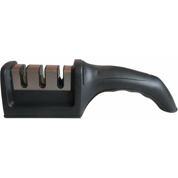 Точилка для ножей Appetite (RS01). Точилка для ножей (черная) выполнена в виде удобного держателя с тремя резцами, которые позволяют производить заточку в три этапа: грубая, деликатная заточка и доводка лезвия. Зона заточки съемная, допустимо мытье в посудомоечной машине. Корпус точилки изготовлен из высокопрочного пластика, ручка приятна на ощупь, эргономична и не скользит в мокрых руках. Основание выполнено из нескользящего материала, что гарантирует безопасность и устойчивость. Подходит для металлических ножей. Размер: 215x50x60 мм.