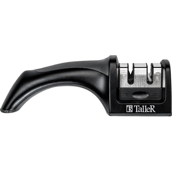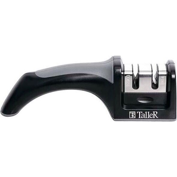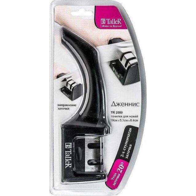 Точилка для ножей "Дженнис" • Размер: 19,1x5,1x6,4 см • 2-х ступенчатая заточка • Угол заточки: 20º • Материал: сталь, керамика, пластик, силиконовые протекторы на основании • Шлифовальный модуль из стали, модуль доводки из керамики •