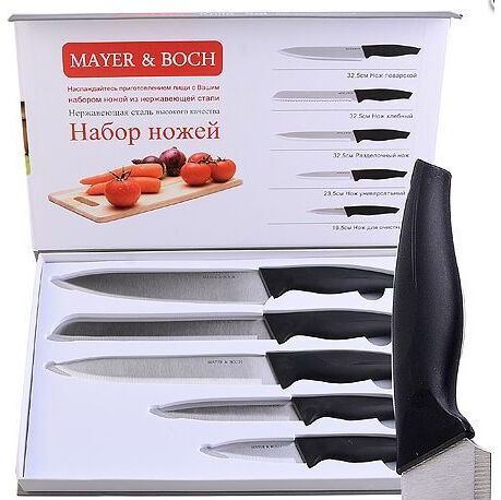 Набор ножей MAYER&BOCH с лезвиями из высококачественной нержавеющей стали станет незаменимым помощником на вашей кухне. Лезвия изготовлены из высококачественной нержавеющей стали. Поверхность клинков легко моется, не впитывает и не «передает» запахи пищи при параллельной нарезке различных продуктов. ». Набор ножей идеально подойдет для резки как мяса и рыбы, так и фруктов и овощей. При помощи керамического ножа-пиллера вы быстро и тонко сможете очистить овощи. Эргономичная рукоятка каждого изделия удобно ложится в ладонь, обеспечивая безопасную работу, комфортное положение в руке, надежный захват и не дает ножам скользить при использовании. Яркий дизайн изделий украсит вашу кухню, а благодаря красивой упаковке, такой набор станет еще и прекрасным подарком!