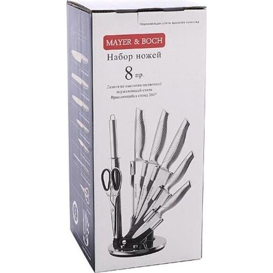 Набор MAYER&BOCH включает в себя 5 ножей разного размера, мусат (ножеточку), ножницы и подставку. Лезвия ножей выполнены из высококачественной нержавеющей стали, имеют гладкую и легко очищаемую поверхность, устойчивы к повреждениям и окислению. Набор ножей идеально подойдет для резки как мяса и рыбы, так и фруктов и овощей. Прочная эргономичная рукоятка каждого изделия, выполненная из нержавеющей стали, удобно ложится в ладонь, обеспечивая безопасную работу, комфортное положение в руке и надежный захват. Все предметы набора компактно размещаются на оригинальной прозрачной акриловой подставке-"веере". Набор MAYER&BOCH включает все необходимые ножи для ежедневного приготовления пищи, а его стильный современный дизайн украсит интерьер вашей кухни. Подходит для мытья в посудомоечной машине.