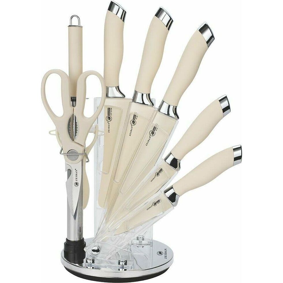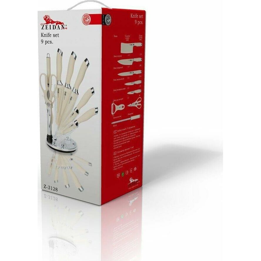 Набор ножей ZEIDAN Z-3128 9 предметов, Набор ножей 9 предметов, (нож- поварской нож -1,5mm/8", нож разделочный -1,5mm/8", нож для хлеба-1,5mm/8", универсальный нож, - 1,2mm/5", нож для овощей – 1,2mm/3,5, мусат, ножницы, овощечистка, прорезиненные ручки с декором, складная подставка, подарочная упаковка.