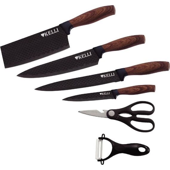 Набор кухонных ножей. 6 предметов. Высококачественная сталь . Топорик кухонный . Нож поварской . Нож универсальный . Нож овощной . Ножницы . Овощечистка . Нержавеющая сталь . Алмазное напыление . Острая режущая кромка . Антибактериальное покрытие . Экологичные материалы .