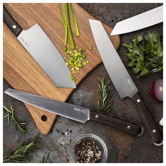 Нож поварской TalleR TR-22052, Katto, длина лезвия 20,0 см, толщина лезвия 2,3 мм Материал: нержавеющая сталь, дерево Рекомендуется ручная мойка Упаковка - цветная коробка