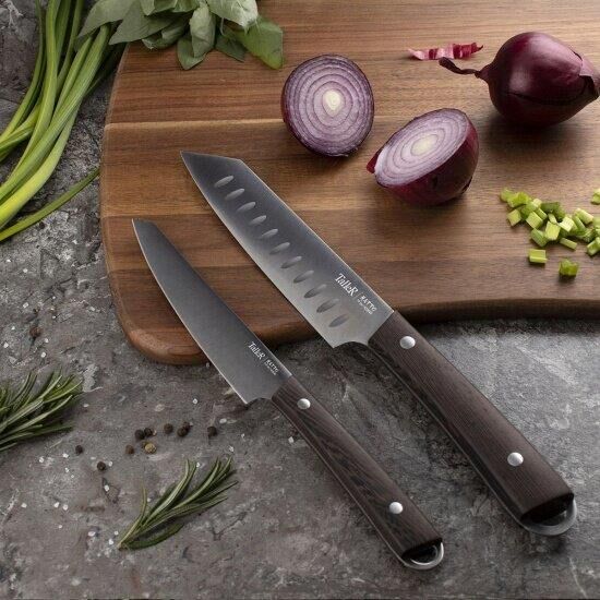 Нож сантоку TalleR TR-22054, Katto, длина лезвия 15,0 см, толщина лезвия 1,8 мм Материал: нержавеющая сталь, дерево Рекомендуется ручная мойка Упаковка - цветная коробка