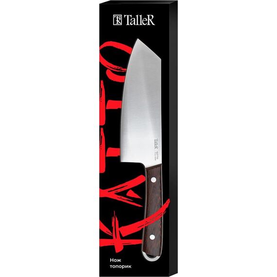 Нож топорик TalleR TR-22051, Katto, длина лезвия 17,5 см, толщина лезвия 2,8 мм Материал: нержавеющая сталь, дерево Рекомендуется ручная мойка Упаковка - цветная коробка