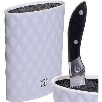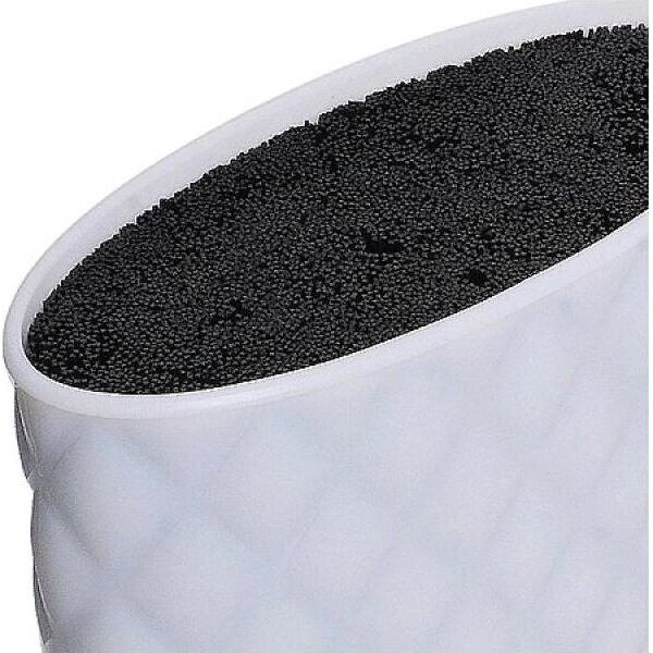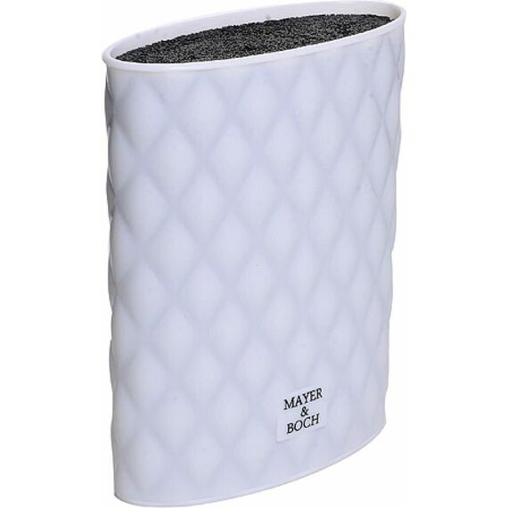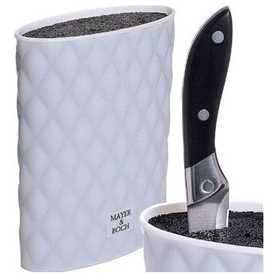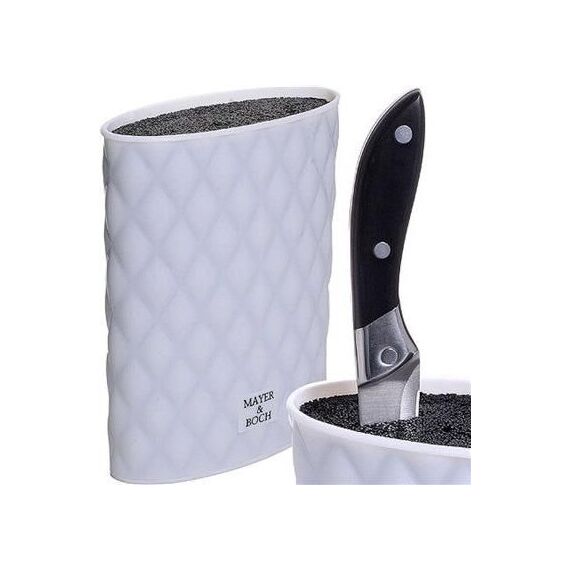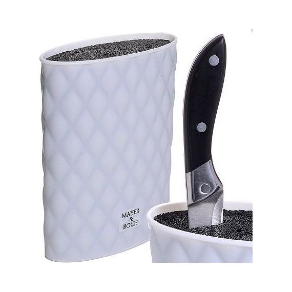 Универсальная подставка MAYER&BOCH позволит хранить ножи и ножницы любой формы, вне зависимости от их размера и лезвия. Корпус подставки выполнен из пластика, что делает ее гигиеничной и долговечной, а уникальный внутренний наполнитель состоит из тонких и гибких полипропиленовых стержней, которые легко моются. Полипропиленовые стержни наполнителя формируют структуру, подобную щетке, поэтому достаточно просто воткнуть нож в подставку, и она надежно удержит его.