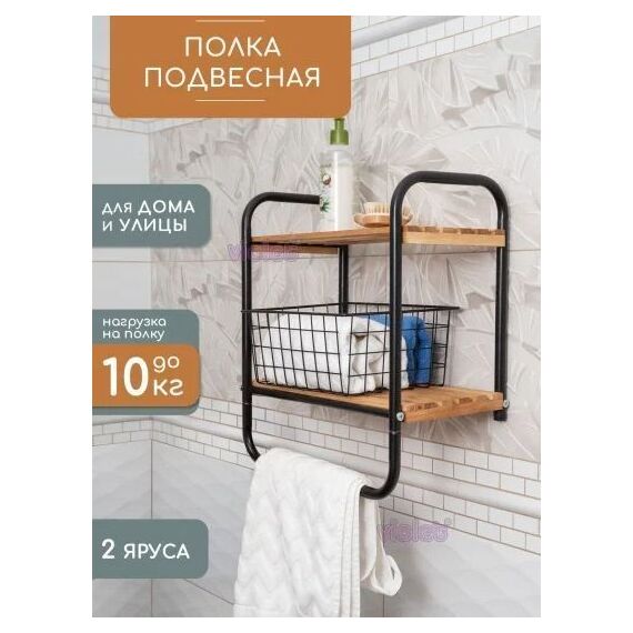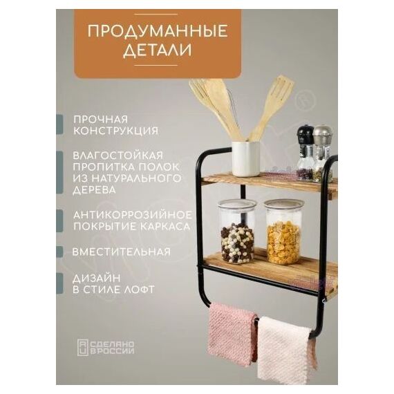 Подвесной стеллаж в современный дизайне — это максимальная функциональность и прочность, идеальное решение для организации пространства на Вашей кухне, ванной или любом другом помещении. Каркас выполнен из металла и окрашен в стойкую порошковую краску черного цвета, полки для кухни выполнены из натурального дерева. Тип крепления на саморезы Глубина предмета 21 см Ширина упаковки (мм) 260 мм Максимальная нагрузка на одну полку (кг) 5 Вес с упаковкой (кг) 1.6 кг Ширина предмета 41 см Страна производства Россия Высота предмета 44.5 см Угловая полка нет Высота упаковки (мм) 100 мм Вес без упаковки (кг) 1.5 кг С крючками нет Длина упаковки (мм) 450 мм Технические особенности Материал изделия сталь; металл