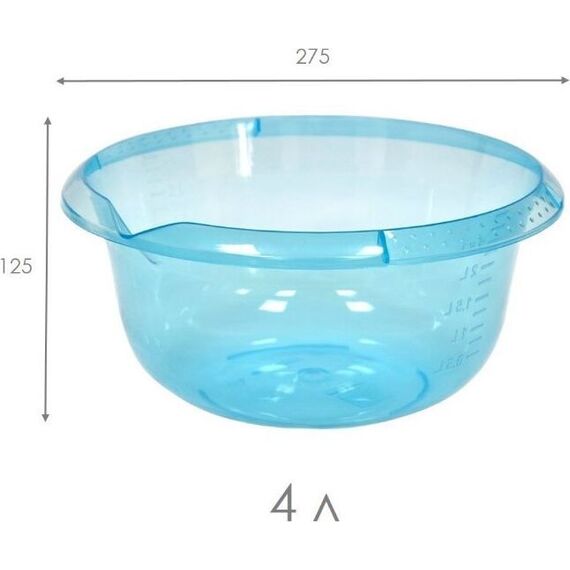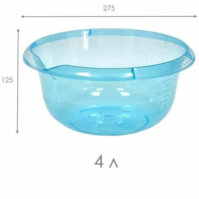 ЦВЕТ: голубой РАЗМЕР ИЗДЕЛИЯ: 275 x 275 x 125 мм МАТЕРИАЛ: Полипропилен Емкость 4 л из пищевого пластика для использования в кулинарии или быту. Прозрачный корпус и мерные деления на внутренней поверхности помогут в соблюдении пропорций смешиваемых продуктов и в замере объема налитой жидкости. Носик на кайме удобен для слива.