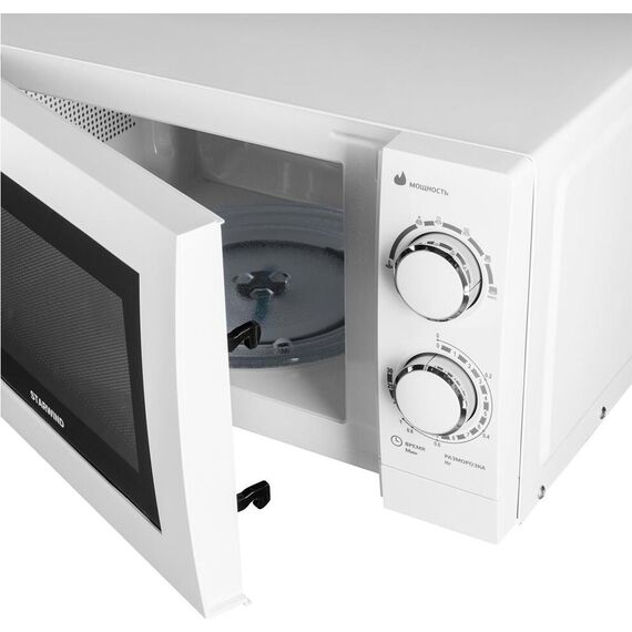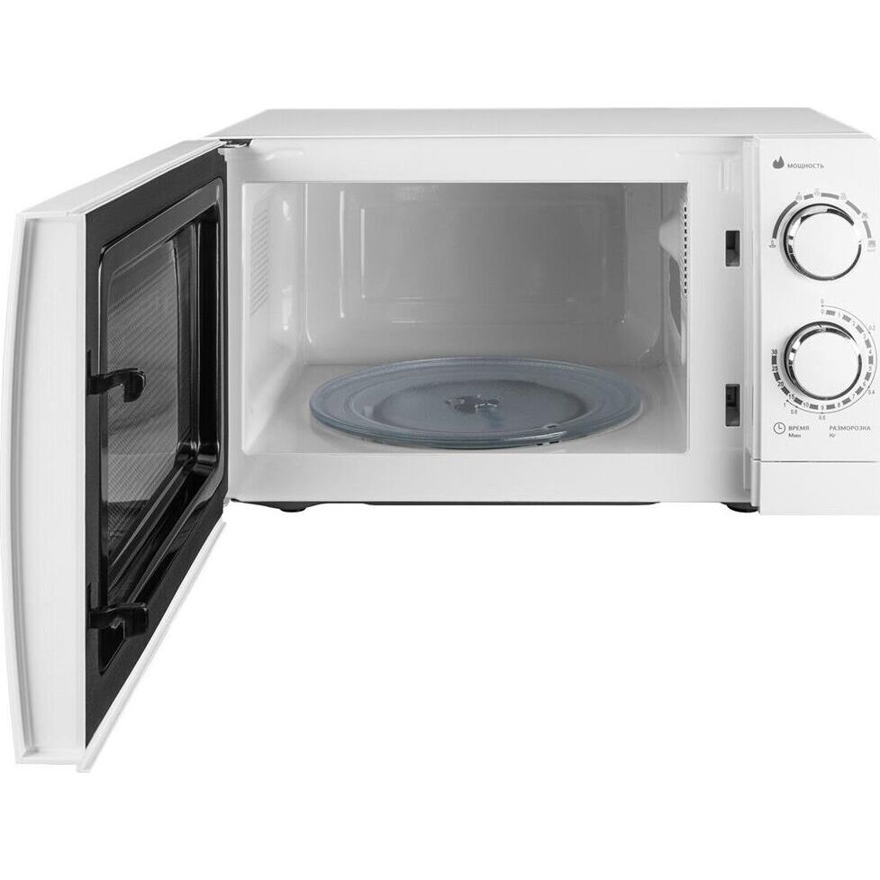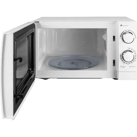 Объем 20 л; Мощность 700 Вт; 6 уровней мощности; Максимальное время приготовления 30 мин; Поворотный стол 24,5 см; Функция разморозки; Сигнал об окончании готовки; Механизм открывания дверцы – кнопка; Тип управления: механический; Цвет: белый