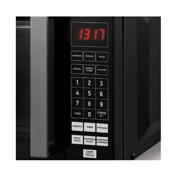 Внутренний объем: 20 л Тип управления: электронное Мощность микроволн: 700 Вт Количество уровней мощности: 6. Открывание дверцы: ручка. Габаритные размеры: 457x271x383 мм. Вес: 10.5 кг. Цвет корпуса: черный .