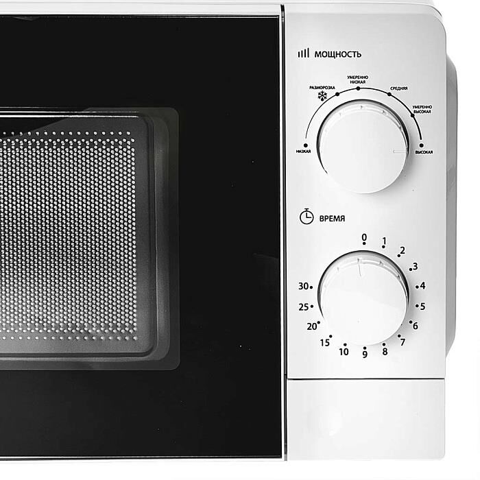 Параметры Номинальная потребляемая мощность 1100 Вт Номинальная выходная мощность 700 Вт Частота микроволн 2450 МГц Внутренний объем 20 л Таймер 30 минут Диаметр вращающегося блюда 245 мм Размеры камеры (В×Ш×Г, мм) 202×301×311 Габаритные размеры (В×Ш×Г, мм) 243×446×332 Вес нетто 9,2 кг Описание Микроволновая печь - электроприбор, предназначенный для приготовления пищи, разогрева и размораживания пищевых продуктов в бытовых и аналогичных условиях Цвет: белый Механический тип управления Открывание дверцы кнопкой Вращающееся стеклянное блюдо диаметром 245 мм Звуковой сигнал окончания приготовления Таймер на 30 минут со звуковым сигналом 6 уровней мощности Режим размораживания