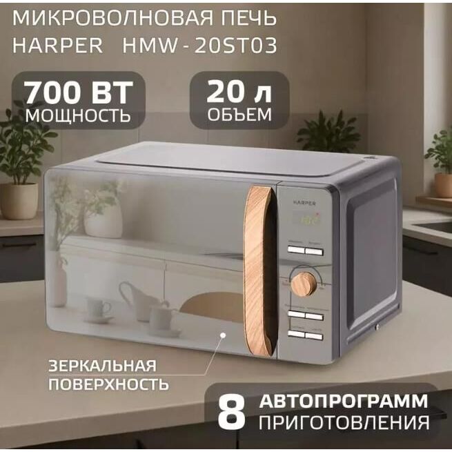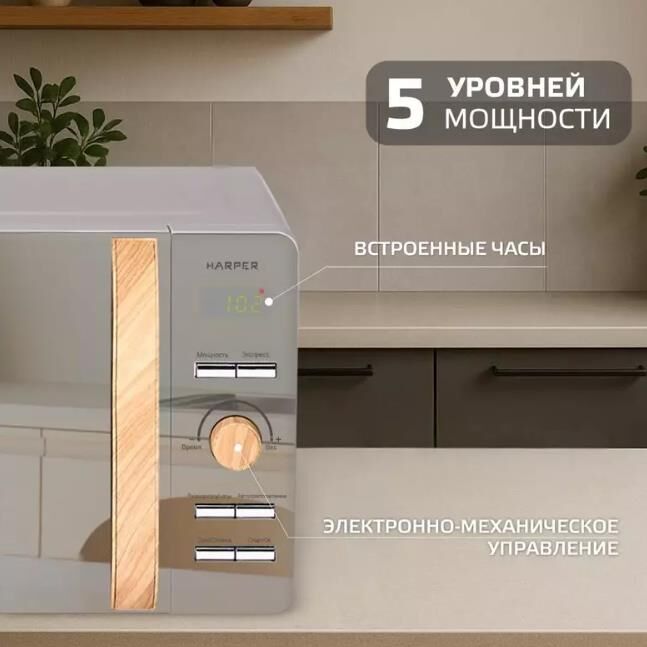 Объем 20 л./ Потребляемая мощность 1150 Вт/ Мощность микроволн 700 Вт/ Количество уровней мощности - 5/ Тип управления - электронный/ Дверца - навесная/ Тип открывания дверцы - ручка/ Подсветка камеры/Цифровой дисплей/ Часы/ Диаметр поддона - 255 мм./ Быстрый старт/ Таймер 60 мин./ Звуковой сигнал завершения работы/ Режим разморозки/ Количество режимов авторазморозки - 3/ Режим последовательного приготовления/ Количество рецептов автоприготовления - 8/ Блокировка от детей/ Внутреннее покрытие камеры - эмаль/ Длина сетевого шнура - 0.85 м./ Размеры (ШхВхГ) - 451х258х344 мм./ Вес - 10.2 кг.