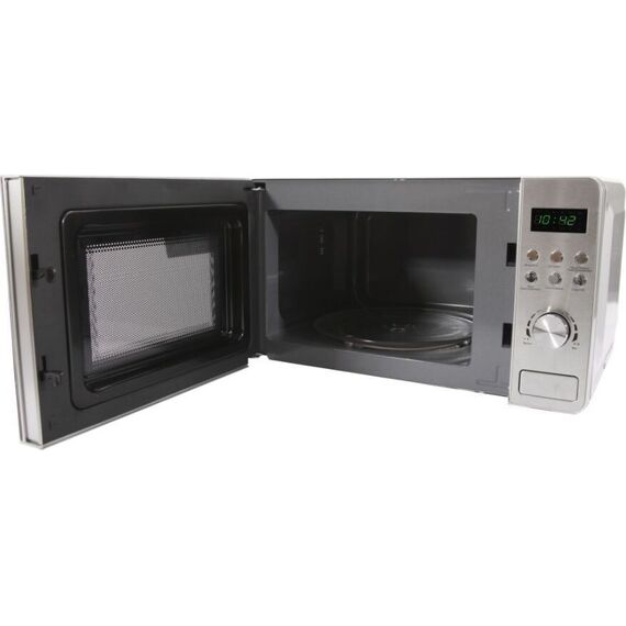 Микроволновая печь, стальной корпус, внутренний объем: 20 литров, выходная мощность печи: 700 Вт, тип управления: цифровой, диаметр поворотного стола: 245 мм, количество уровней мощности: 5, количество программ автоматического приготовления: 8, автоматическое размораживание, таймер: 60 минут, блокировка от детей, тип открывания дверцы: кнопка, мигнал окончания приготовления, цвет панели: стальной , цвет корпуса: черный