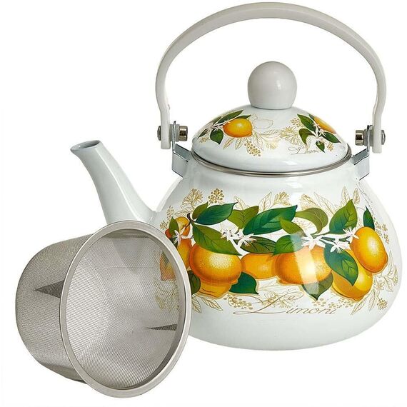 Параметры Объем 1,3 л Описание Чайник эмалированный с фильтром из нержавеющей стали Материалы: эмалированная сталь, нержавеющая сталь, пластик Серия: Лимоны Трехслойное внутреннее и внешнее эмалевое покрытие, устойчивое к воздействию пищевых кислот Эргономичная подвижная пластиковая ручка Зачерненное дно с повышенной термоотдачей Съемный фильтр из нержавеющей стали Классический дизайн Экологически чистые материалы Может быть использован на всех типах кухонных плит: электрических, газовых, керамических, индукционных Можно мыть в посудомоечной машине Упаковка: цветная коробка