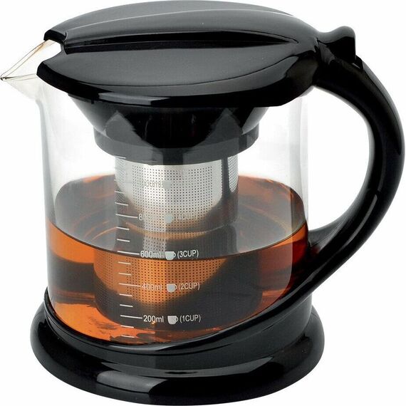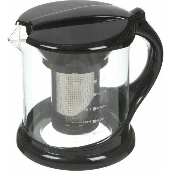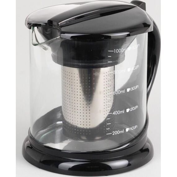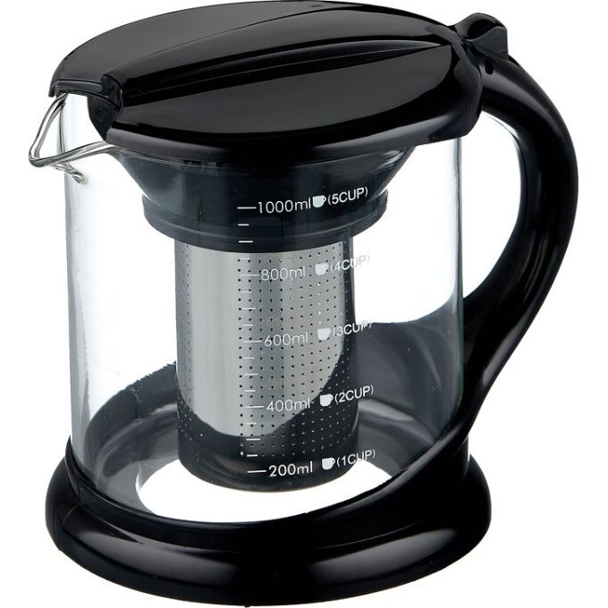 Чайник заварочный Отметки литража Цвет - черный Корпус из жаропрочного стекла/крышка/ ручка из пластика Фильтр из нержавеющей стали Объем - 1000 мл 4~11.5 10-6 - коэффициент линейного расширения Упаковка - пузырчатая пленка/цветная коробка