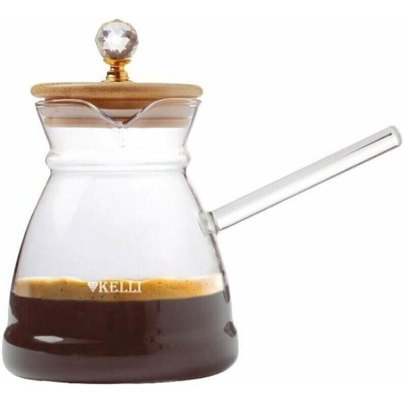 Турка из термостойкого стекла Объём: 0,6л. Жаропрочное стекло. Стильная крышка из бамбука с "бриллиантом". Оригинальный дизайн. Эргономичная ручка. Легко чистится. Пригоден для мытья в посудомоечной машине.