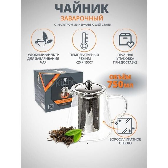 Чайник заварочный, AROMA. Материал: жаропрочное боросиликатное стекло. Крышка/фильтр из 304 нержавеющей стали. Объем: 750 мл. Температурный режим: -20 +150С, без резких перепадов температур. Не рекомендуется мыть в посудомоечной машине. Мыть теплой водо