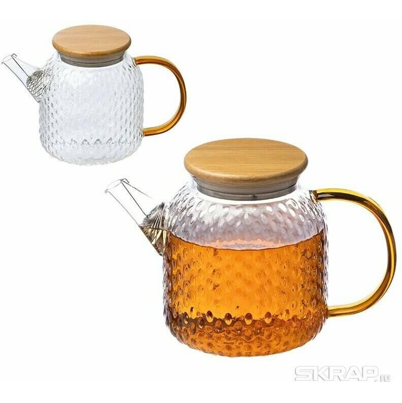 Чайник заварочный AROMA, объем 1 л, из боросиликатного стекла с рельефом, с крышкой из бамбука и ручкой из окрашенного стекла. Материал: высококачественное боросиликатное стекло, фильтр из 304 стали, крышка - бамбук/силикон/нерж сталь. Объем 1 л. Упаковка