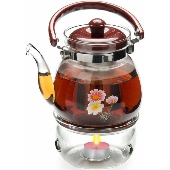 Чайник заварочный МВ (х12). Материал корпуса: боросиликатное стекло. Крышка/ручка: пластик. Фильтр: нержавеющая сталь, пластик. Колба д/подогрева: боросиликатное стекло. Подставка на колбе: нержавеющая сталь. Цвет: коричневый, зеленый, розовый. Рисунок: ромашки. Объем: 1,1 л. Высота чайника с крышкой: 15 см. Диаметр чайника: 13 см. Высота чайника с подогревателем: 21,5 см. Размер упаковки: 15,4 х 14,7 х 23,2 см. Упаковка: коробка. Вес: 720 г. Страна производитель: Китай.