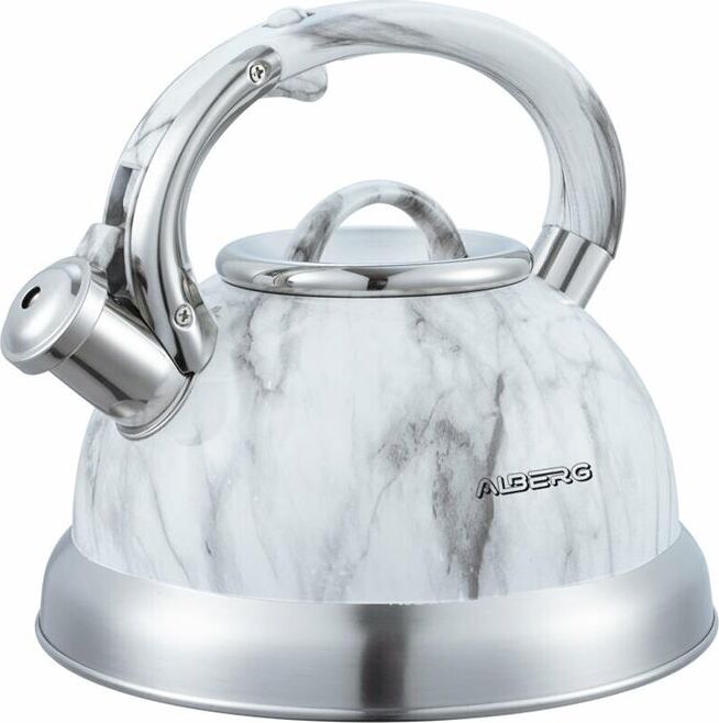 Объем: 3 л Свисток металл, с курковым механизмом открывания Нержавеющая сталь 0.5 мм Внешнее термостойкое покрытие «Белый мрамор» Фиксированная ручка «Белый мрамор» 3-х слойное термоаккумулирующее капсулированное индукционное дно Подходит для всех видов плит, включая индукционные Вес чайника: 900 г