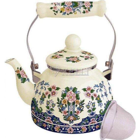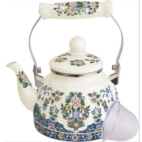 Эмалированный чайник с ситом Объем: 1,5 л. 3-х слойное внутреннее и внешнее эмалированное покрытие Удобная керамическая ручка не нагревается Сито для заварки Подходит для всех видов плит Пригоден для посудомоечной машины Стильный дизайн