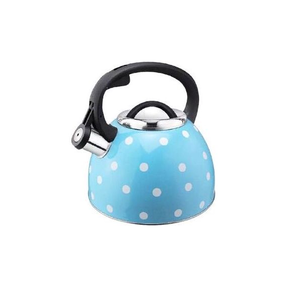 Чайник из нержавеющей стали #201 со свистком с крышкой, с ручкой из нейлона, матовый внутри/окрашенный — снаружи, голубой в белый горошек. глянцевая окрашенная поверхность корпуса. дно — одинарное, подходит для всех типов плит, толщина стали — 0,3 мм, литраж — 2,5 литра, упаковка — цветная коробка. Модель — Maestria. Материалы: нержавеющая сталь, нейлон.