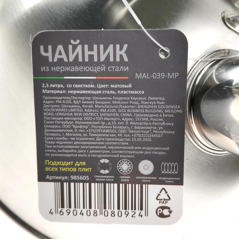 Чайник из нерж. стали со свистком Эконом-вариант для промо. Толщина стенок - 0,3 мм. Объем - 2,3 литра. Материалы - нерж сталь № 201, нейлон Ручка: нейлон Одинарное дно Со свистком Не рекомендуется мыть в посудомоечной машине. Упаковка: ПЭ пакет + хенгтег.