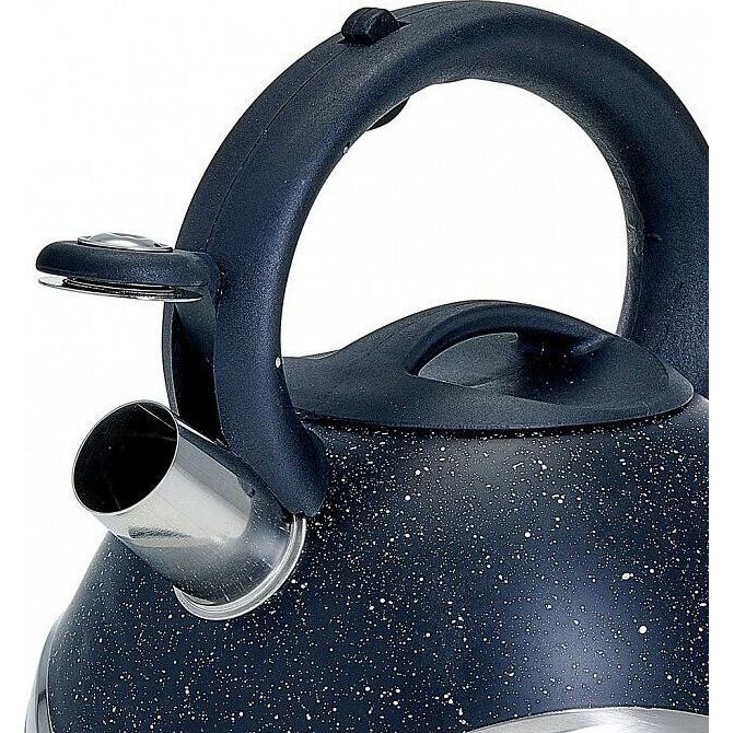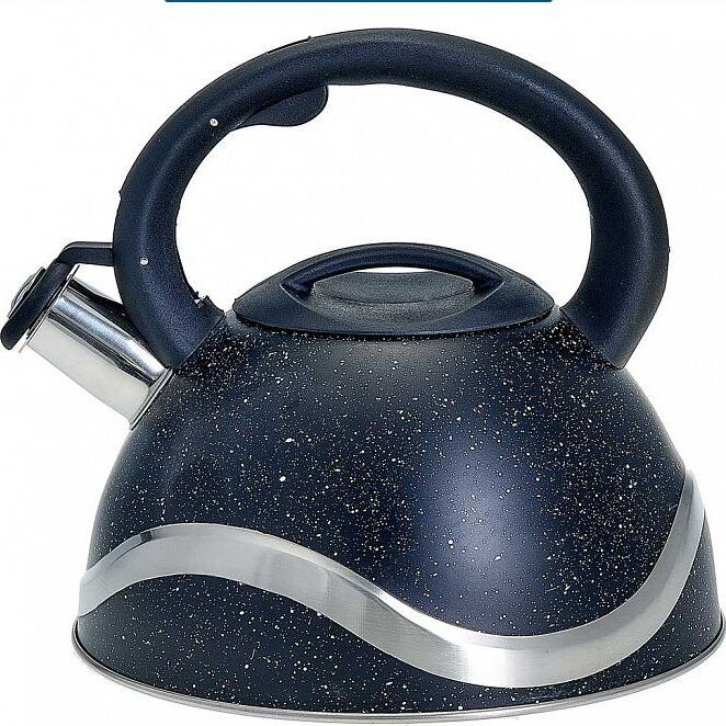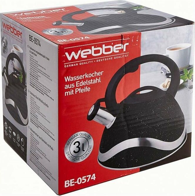 WEBBER BE-0574 Чайник из нерж.стали 3л, капсулированное дно Параметры Объем 3 л Толщина стали 0,4 мм Описание Чайник из нержавеющей стали со свистком Высококачественная нержавеющая сталь c цветным покрытием Цвет: черный мрамор Капсулированное дно Нейлоновая ручка с кнопкой открывания носика Цвет ручки и крышки: черный Пригоден для использования на всех типах кухонных плит, кроме индукционных