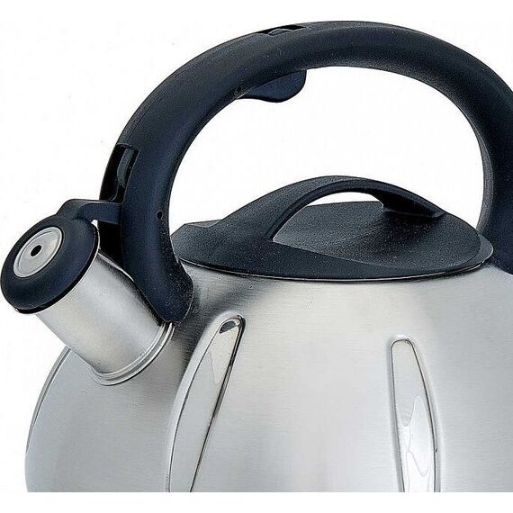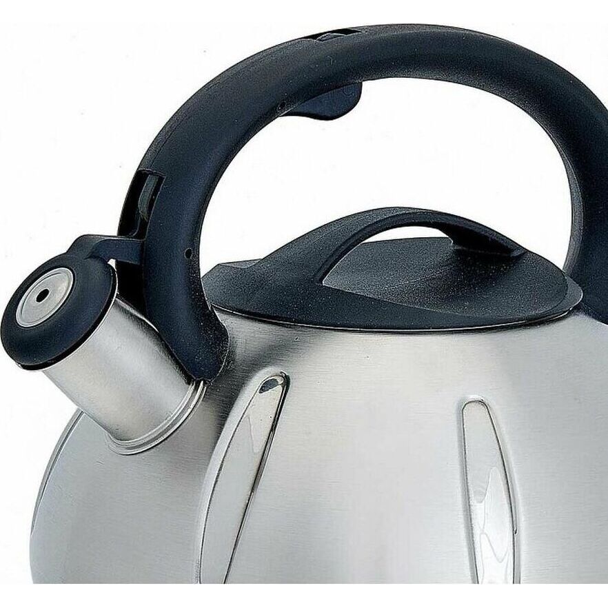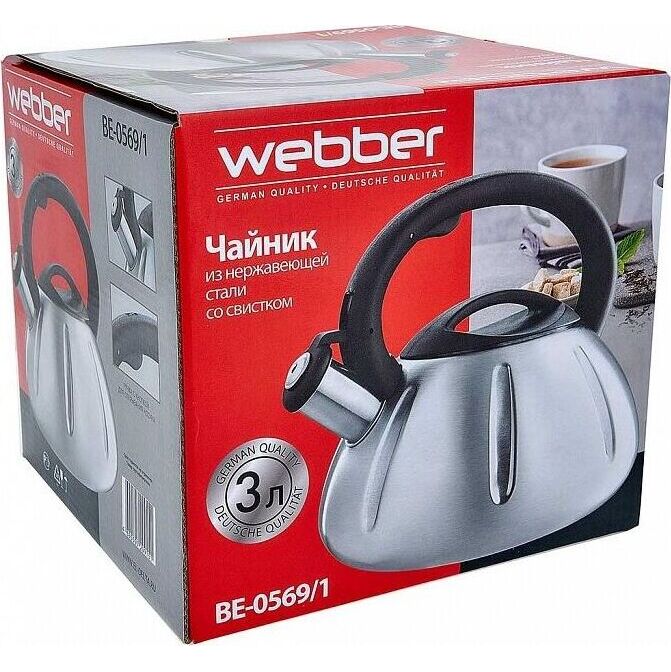 WEBBER BE-0569/1 Объем 3 л., Толщина стенок 0,6 мм. Чайник из нержавеющей стали со свистком. Высококачественная нержавеющая сталь. Матовая сатиновая полировка. Индукционное дно. Нейлоновая ручка с кнопкой открывания носика. Цвет ручки и крышки: черный. Пригоден для использования на всех типах кухонных плит, включая индукционные.