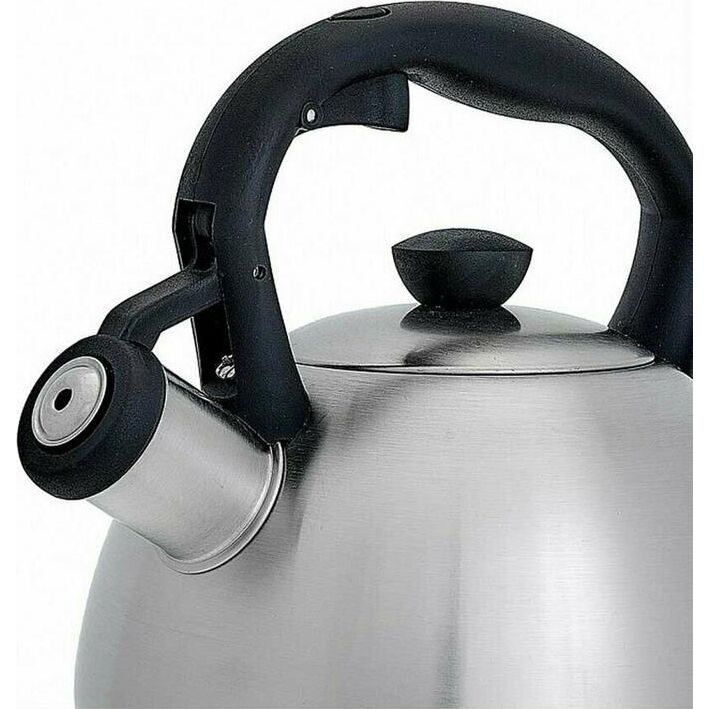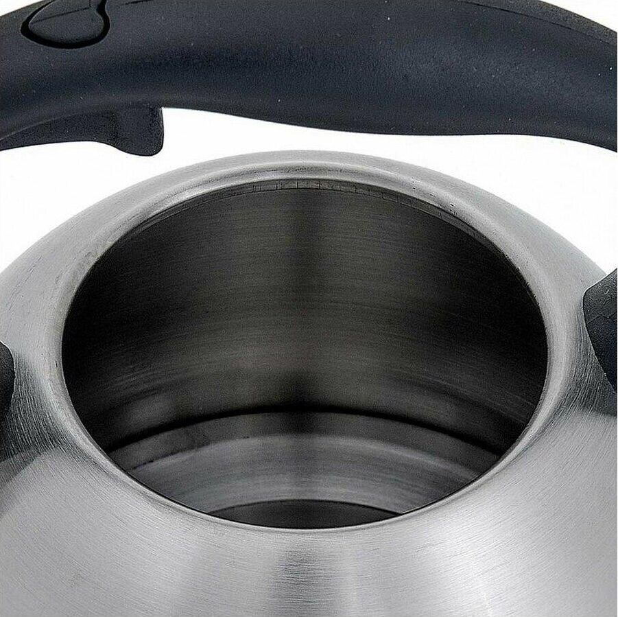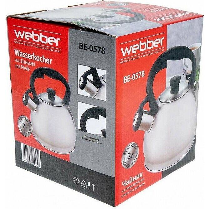 WEBBER BE-0578 Объем 2л. Чайник из нержавеющей стали со свистком. Высококачественная нержавеющая сталь. Матовая полировка. Индукционное дно. Термостойкая пластиковая ручка с кнопкой для открывания носика. Цвет ручки: черный. Пригоден для использования на всех типах кухонных плит, включая индукционные.