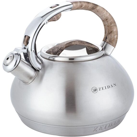 Чайник со свистком ZEIDAN Z-4476 3,0 л , Чайник со свистком, 3,0 л, нержавеющая сталь, семислойное капсулированное индукционное дно, курковый механизм, матовая полировка корпуса, фиксированная комбинированная ручка.
