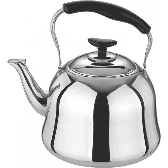 Металлический чайник на газ Объем: 4,5л Высококачественная нержавеющая сталь Свистит при закипании Носик с крышкой Крышка со свистком Удобная подвижная ручка не нагревается Утолщенное дно