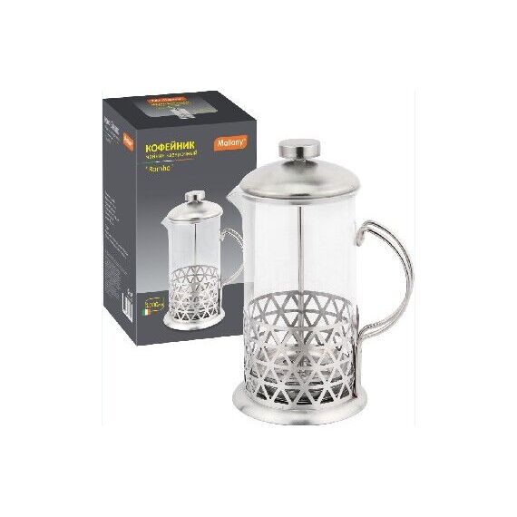 Кофе-пресс/чайник заварочный серия Rombo, объем 350 мл, тм MALLONY Предназначен для заваривания чая, кофе, прочих напитков. Коэффициент линейного расширения - 3,0. Корпус/фильтр/стержень из нержавеющей стали № 201, колба из жаропрочного боросиликатного стекла. Крышка - нерж сталь № 201/пластмасса. Толщина стекла - 1,3 мм Толщина нерж стали - 0,35 мм Можно мыть только стекл колбу в посудомоечной машине, остальные части не рекомендуется мыть в посудомоечной машине (можно мыть мягким моющим средством и теплой водой, хорошо просушивать). Упаковка: цветная картонная коробка.