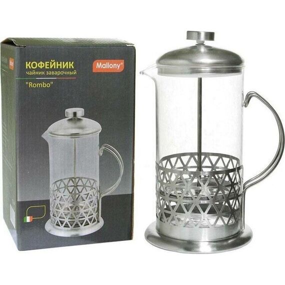Кофе-пресс/чайник заварочный серия Rombo, объем 800 мл, тм MALLONY Предназначен для заваривания чая, кофе, прочих напитков. Коэффициент линейного расширения - 3,0. Корпус/фильтр/стержень из нержавеющей стали № 201, колба из жаропрочного боросиликатного стекла. Крышка - нерж сталь № 201/пластмасса. Толщина стекла - 2 мм Толщина нерж стали - 0,3 мм Можно мыть только стекл колбу в посудомоечной машине, остальные части не рекомендуется мыть в посудомоечной машине (можно мыть мягким моющим средством и теплой водой, хорошо просушивать). Упаковка: цветная картонная коробка.