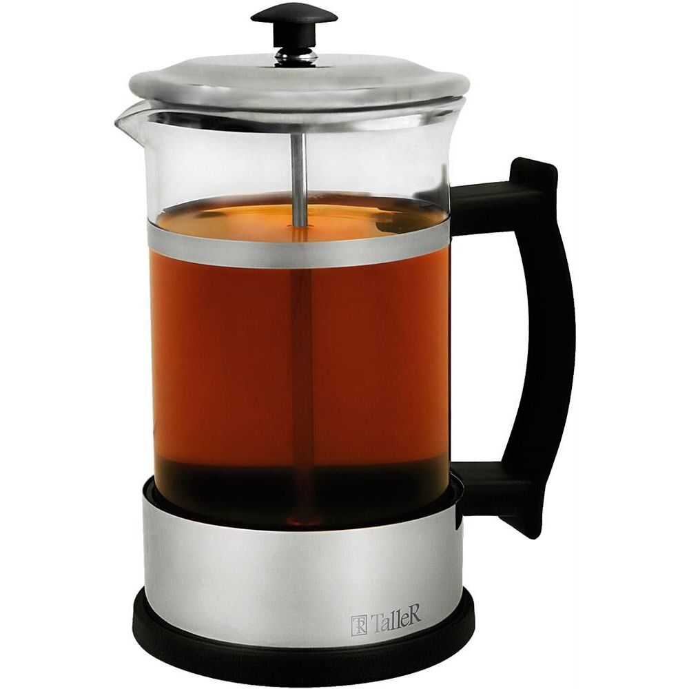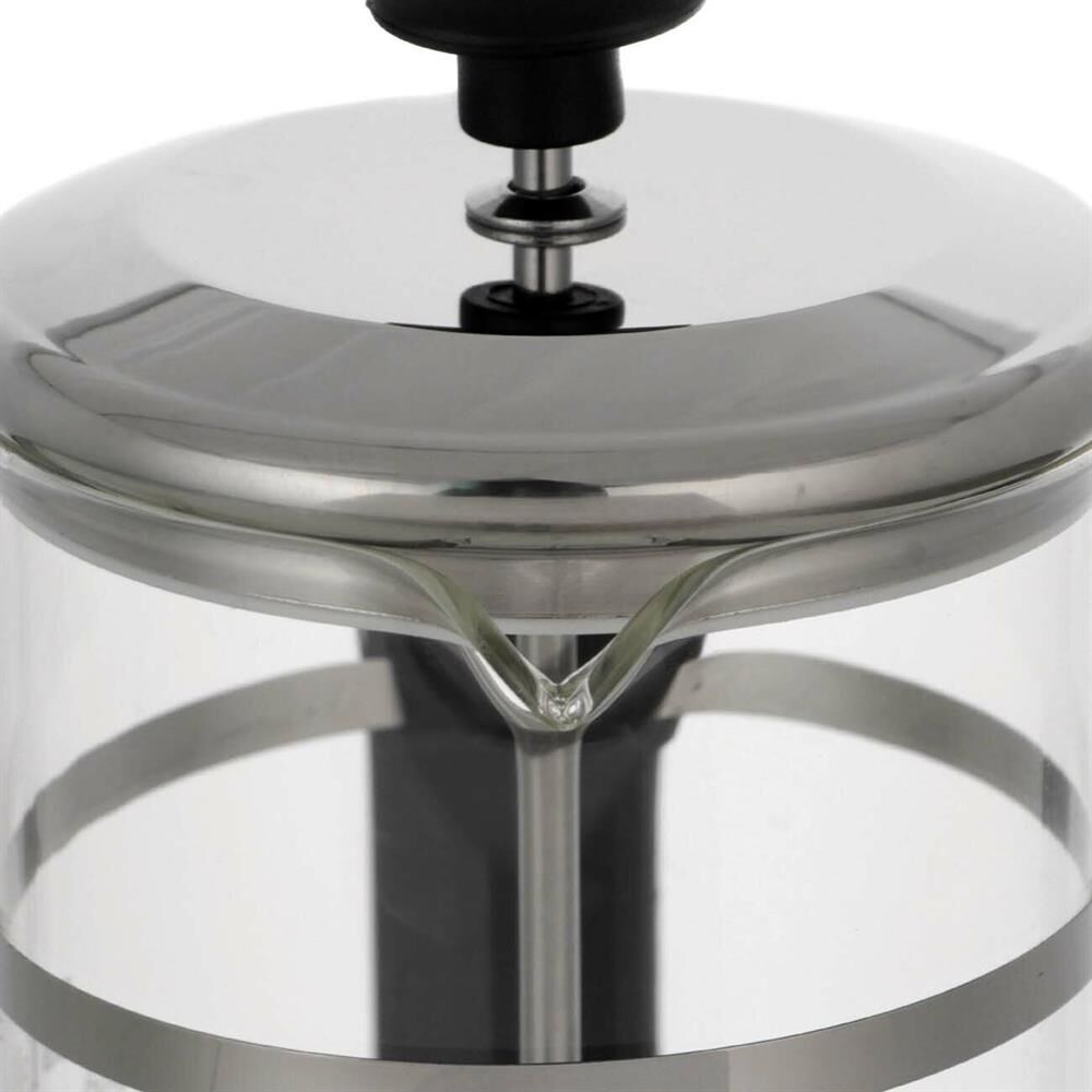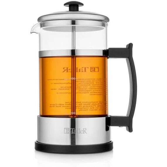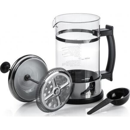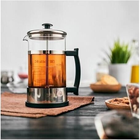 френч-пресс 600 мл, мерная ложка, буклет с рецептами Материалы: боросиликатное стекло, высококачественная нержавеющая сталь Толщины: стекло — 2,0 мм, подстаканник — 0,8 мм, детали пресс-фильтра — 0,3 мм Пригоден для мытья в посудомоечной машине